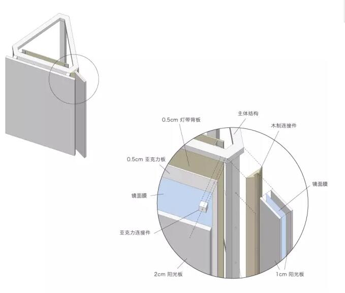缝留了,图画了,协作派对一看,说不喜欢缝。我们解释了这样做的理由,他们表示同意,但仍然觉得缝太大,怕 LED 灯带、龙骨、连接件等一干本不应被人看见的东西被看见。我们只想着白天的情况(可怕的惯性),拍胸脯保证这个空隙很小,人是看不见后面的。结果他们做了个 1:1 的模型,一举击穿「看不见后面」的谣言。