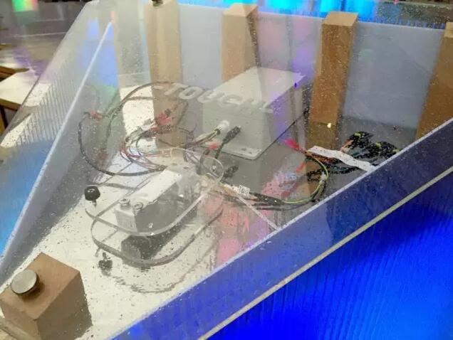 但我们并没有把所有会进水的地方都封上。从下图可以清晰的看到,蓝色的顶跟黄色的板之间有空隙。首先,这里进水不影响灯带,灯带在「灯箱」里干爽着呢。其次,我们猜想如果水滴留在阳光板上,就可以像放大镜一样强化灯光效果。结果居然是真的。