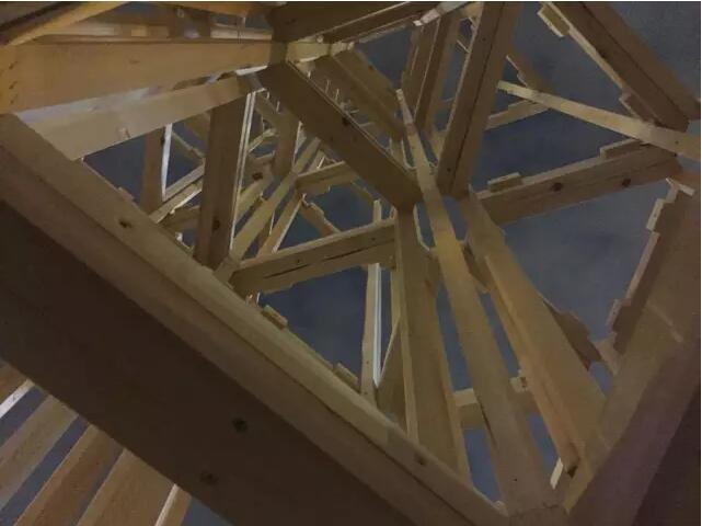 我们也不依不挠的跟他细细说明。除了「三角形啊,很稳的」这种人尽皆知的,还有「我们这个塔下大上小的,很稳的,你去看那些高层建筑,很多都是这样的」,以及「即使龙骨截面只有30mm,即使是木的,但你看看这密度,而且它们相互有拉结,很强的」,说这个的时候什么拧成一股绳、一把筷子弄不断这种老梗都纷纷使出来了。